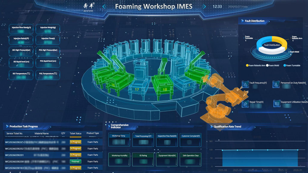 В рамках цифровой матрицы Benfeng Seats IMES (Интеллектуальная производственная платформа Benfeng Seats) цех вспенивания с высокоинтеллектуальной производственной средой стал основным центром создания комфортных сидений.