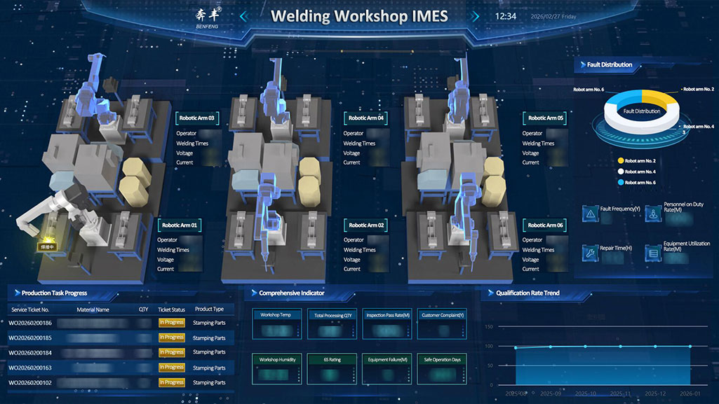 С помощью технологии 3D-визуализации мастерская наглядно демонстрирует совместную работу нескольких интеллектуальных сварочных роботов. Каждый роботизированный манипулятор оснащен специальным оператором и модулем мониторинга параметров (напряжение, ток, количество сварок и т. д.), что обеспечивает точный и контролируемый процесс сварки. Одновременно он отслеживает ключевые показатели, такие как температура, влажность и количество сварочных операций в день, в режиме реального времени, обеспечивая качество сварки со всех сторон, от окружающей среды до процесса.